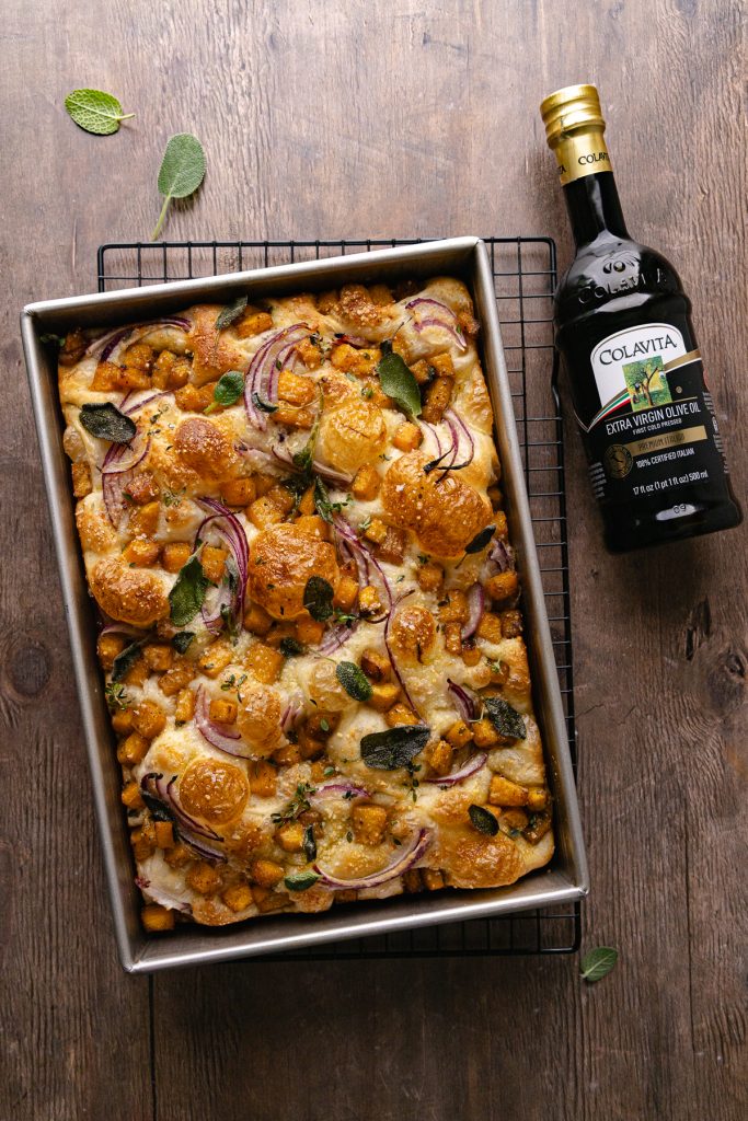 As soon as it comes out of the oven, let it sit in the tray for a minute or two and then transfer the focaccia onto a wire rack to cool. This will prevent the bottom from getting soggy. Cool for at least 15 minutes before serving. Enjoy!