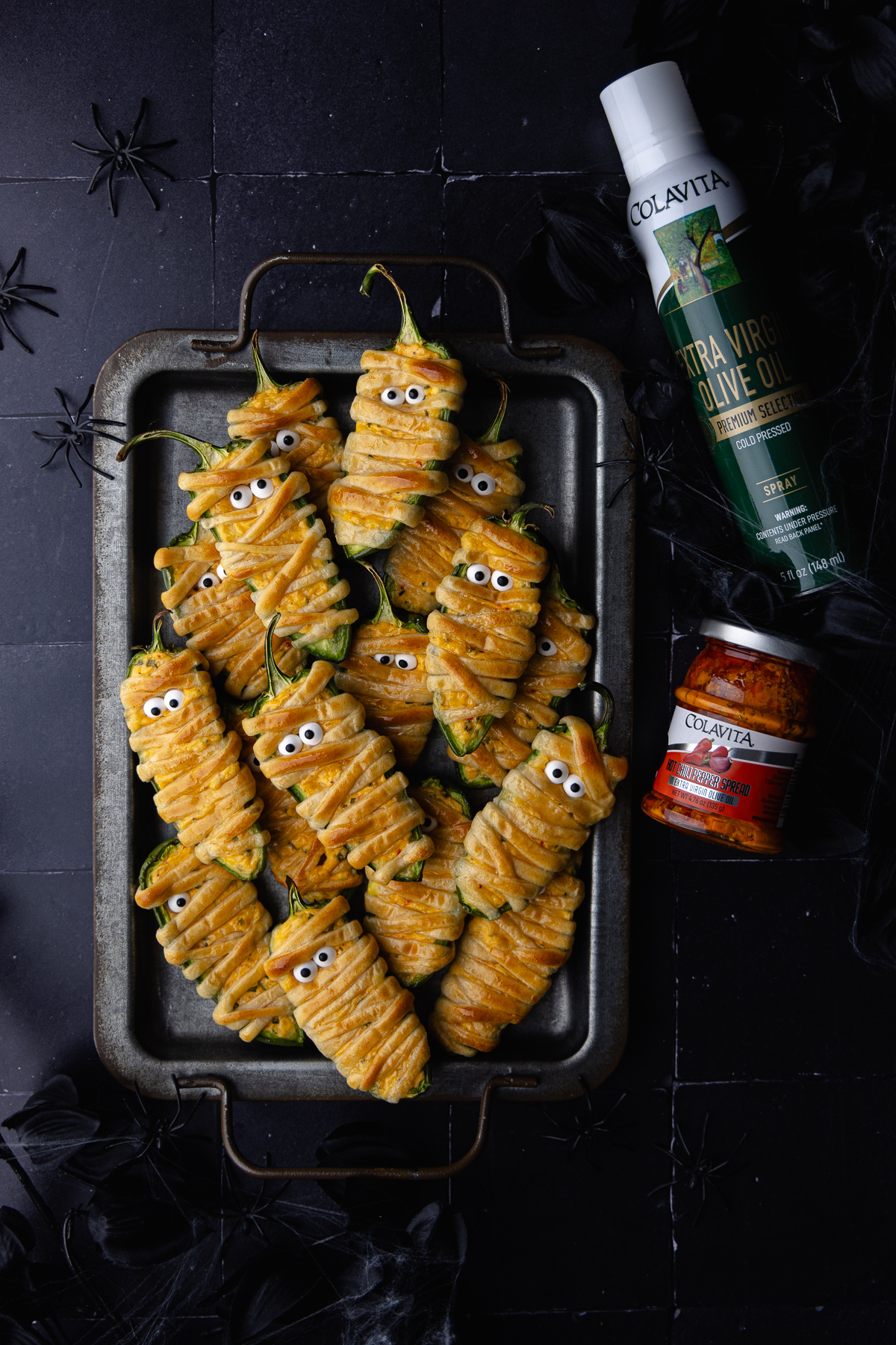Arrange the wrapped jalapeños on the prepared baking sheet. Spray the tops with Colavita extra-virgin olive oil spray or lightly brush with an egg wash. Bake for 10-15 minutes or until the pastry is golden brown.