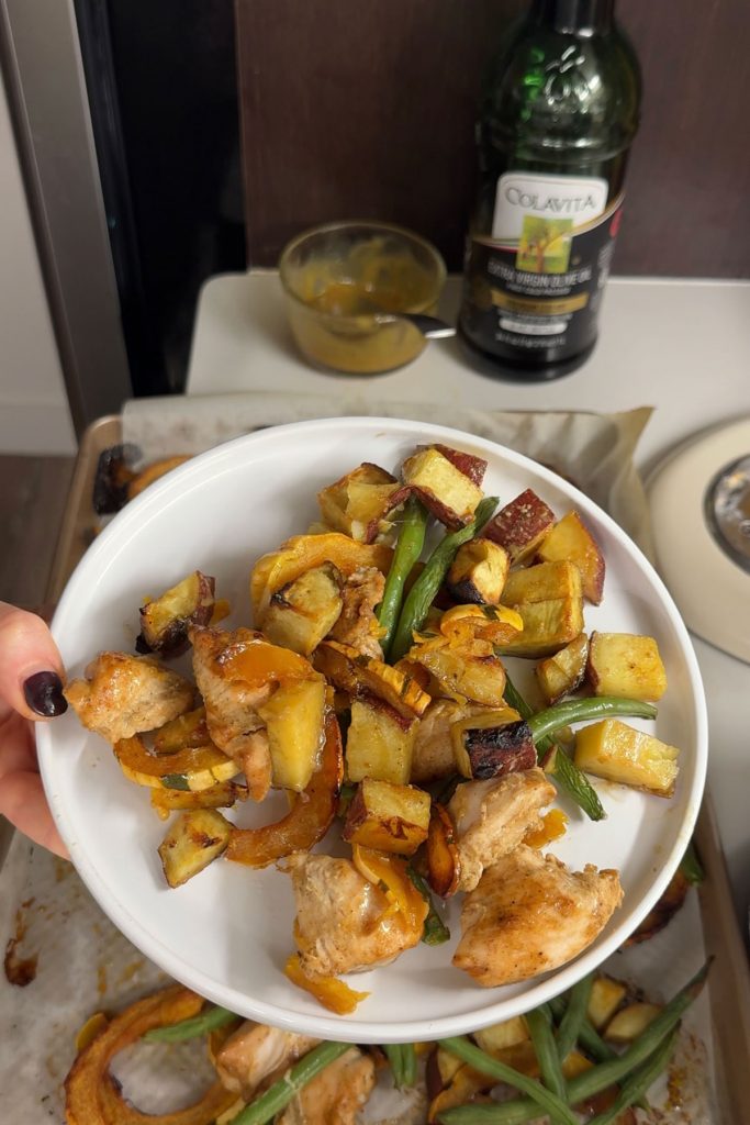 add half the marinade to the veggies, mix and roast with an additional tablespoon of olive oil