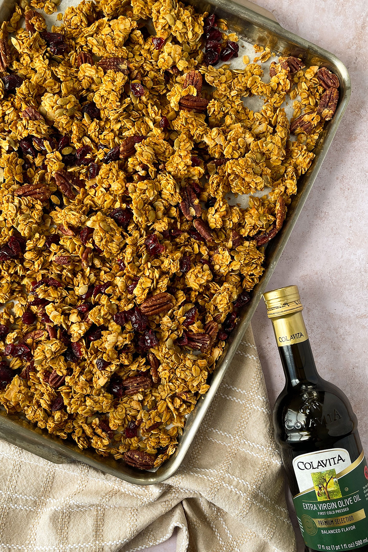 Let the granola sit on the pan for 15 minutes before breaking into clusters and stirring in the dried cranberries. Allow to cool completely before storing in an airtight container for up to 2 weeks.